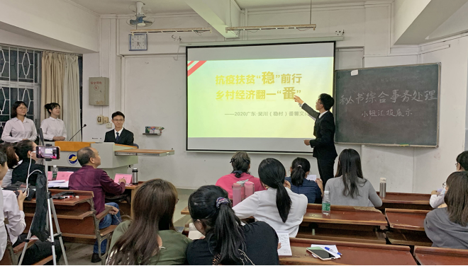 本次比赛由“秘书专项事务处理”和“秘书综合事务处理”两部分组成。在“秘书专项事务处理”比赛中,进入决赛的21位选手在肃穆的考场氛围中沉着冷静、认真答题,充分展示了秘书学学子的专业素养。“秘书综合事务处理”环节中,各组选手围绕“吴川市稳村番薯节活动”展开策划,主旨清晰,特色鲜明,赢得了在座评委的一致好评。经过激烈角逐,曾润妍同学荣获“秘书专项事务处理”一等奖。黄宇龙、林妍芝、林金霞、马佩珊团队荣获“秘书综合事务处理”团队一等奖。
