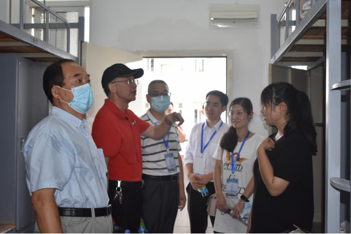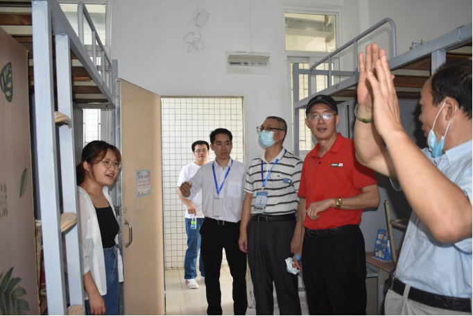 随后,院领导跟随志愿者的指引,深入探访员工宿舍,分别到达女生宿舍海浪大院,男生宿舍海乐大院,实地查看宿舍大院进出防控检测、员工住宿及卫生消毒等情况。在宿舍与新生进行交流,详细了解新生生活方面的需求,并欢迎他们来到海大,成为海大的一分子。