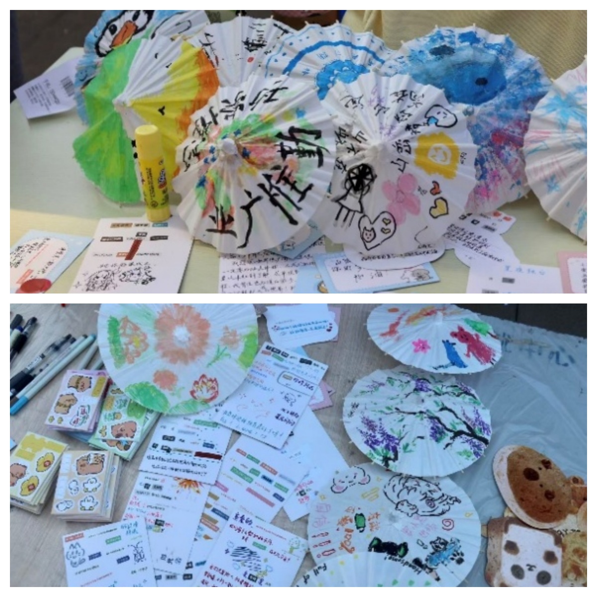 上午9时,志愿者们布置好摊位后,活动正式开始。志愿者积极宣传,吸引同学们前来参与。在手绘油纸伞和DIY拼贴诗环节中,同学们在志愿者的指导下,发挥想象力,绘制了精美的油纸伞和充满意趣的拼贴诗。在随后的手写祝福卡片环节,同学们纷纷写下对希望小学小朋友们真挚且温暖的祝福。而最后的抽奖环节,大大提升了同学们的参与感和体验感。