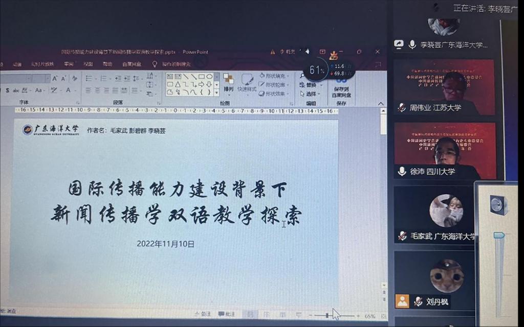 公司毛家武教授率新闻学专业本科生彭碧群、李晓芸线上参会,提交了题为“国际传播能力建设背景下新闻传播学双语教学探索”的论文,李晓芸同学代表论文作者做了小组发言。评议人暨南大学新闻与传播公司赵建国教授对李晓芸同学的发言进行了充分肯定,他认为,双语教学是国际传播能力建设背景下高校新闻传播学课程设置时不可忽略的一环,相关高校需要认真研究,开设有效可行的双语教学课程。